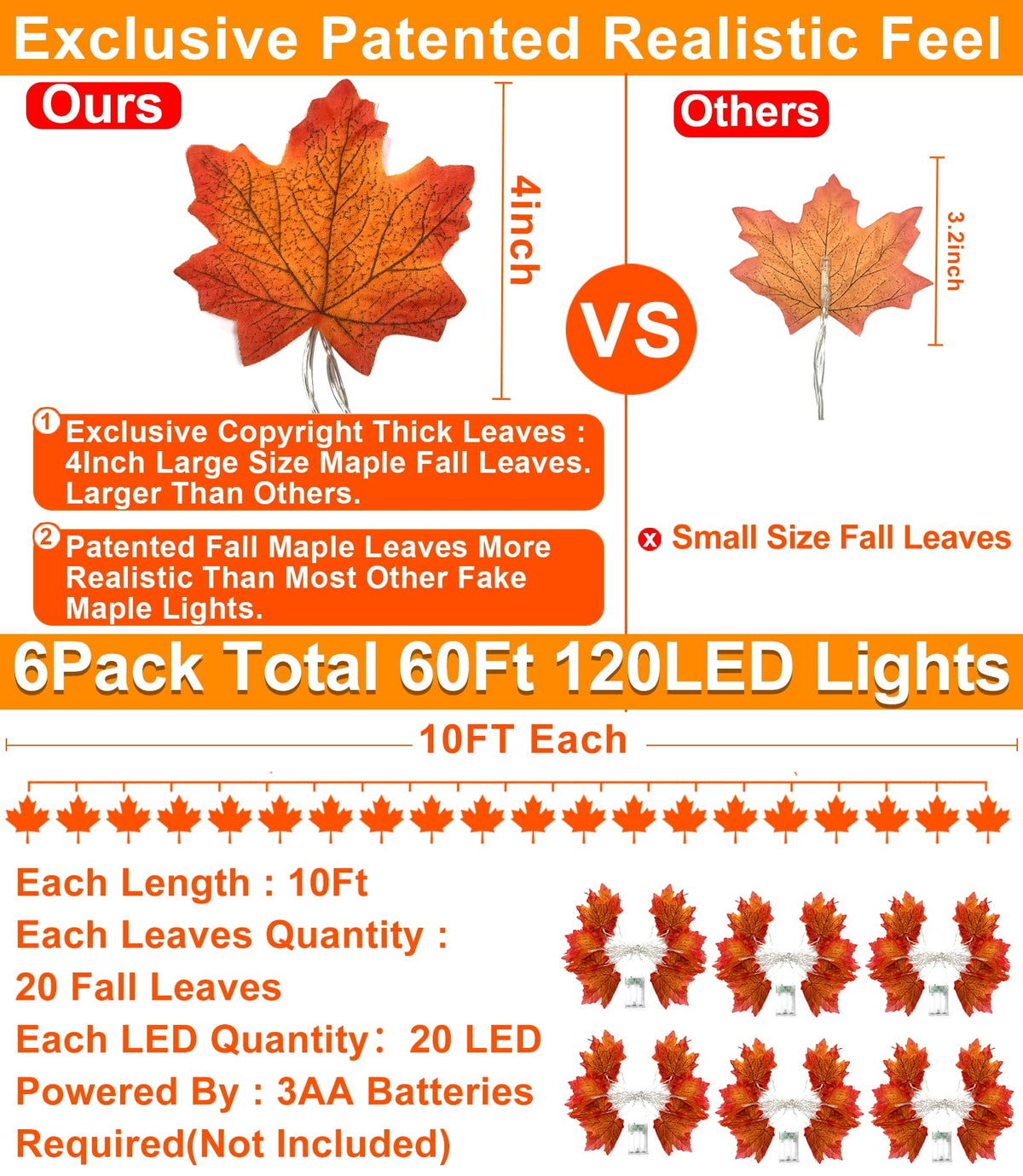 • Design Patent Enlarged Maples Leafed Lights for Days and Nights Fall Halloween Decor: Design Patent Maples Leafed. 2 Pack Total 20ft/40 LED Lights with 40 fallen leafed decoration. The maples leafed are specially enlarged to 4 inch